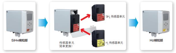 通過完全共享傳感器單元,只需更換傳感器單元即可改變可燃氣體、毒性氣體、氧氣等檢測對象氣體!