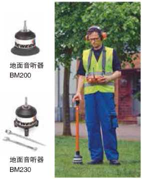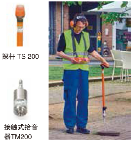 就是在有疑似漏點的管段采用提桿TS200和地面音聽器BM200(平整地面)或BM230(非平整路面)聯結在一起,沿著管道方向,以較小的間隔逐點測量,以耳機音頻或圖形顯示和比較噪音強度大小,很容易確定漏點的準確位置。
