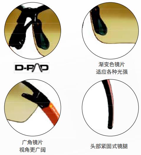時尚款整片式漸變色防護眼鏡,高對比色酷絢外形,一體式變色鏡片,軟質PVC鼻梁架,復合材料頭部緊固式鏡腿,符合人體工程學,消除普通鏡腿給耳朵的不適。黑色流線型前額鏡架,與時尚墨鏡設計理念同出一轍,讓你在防護自身的同時也不落后于時尚的潮流。