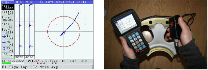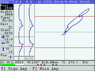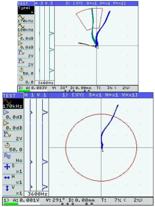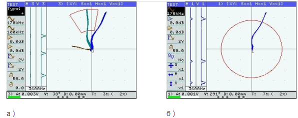 ?渦流信號顯示:a)復平面(XY)–允許通過分析信號波形來檢測干擾中的缺陷;b)兩通道成熟度的生成,可用于抑制干擾因素并減少其對測試結果的影響(進行混合時,操作員可以選擇5種算法之一:加法,減法,水平反轉加法,垂直反轉加法和乘法)。