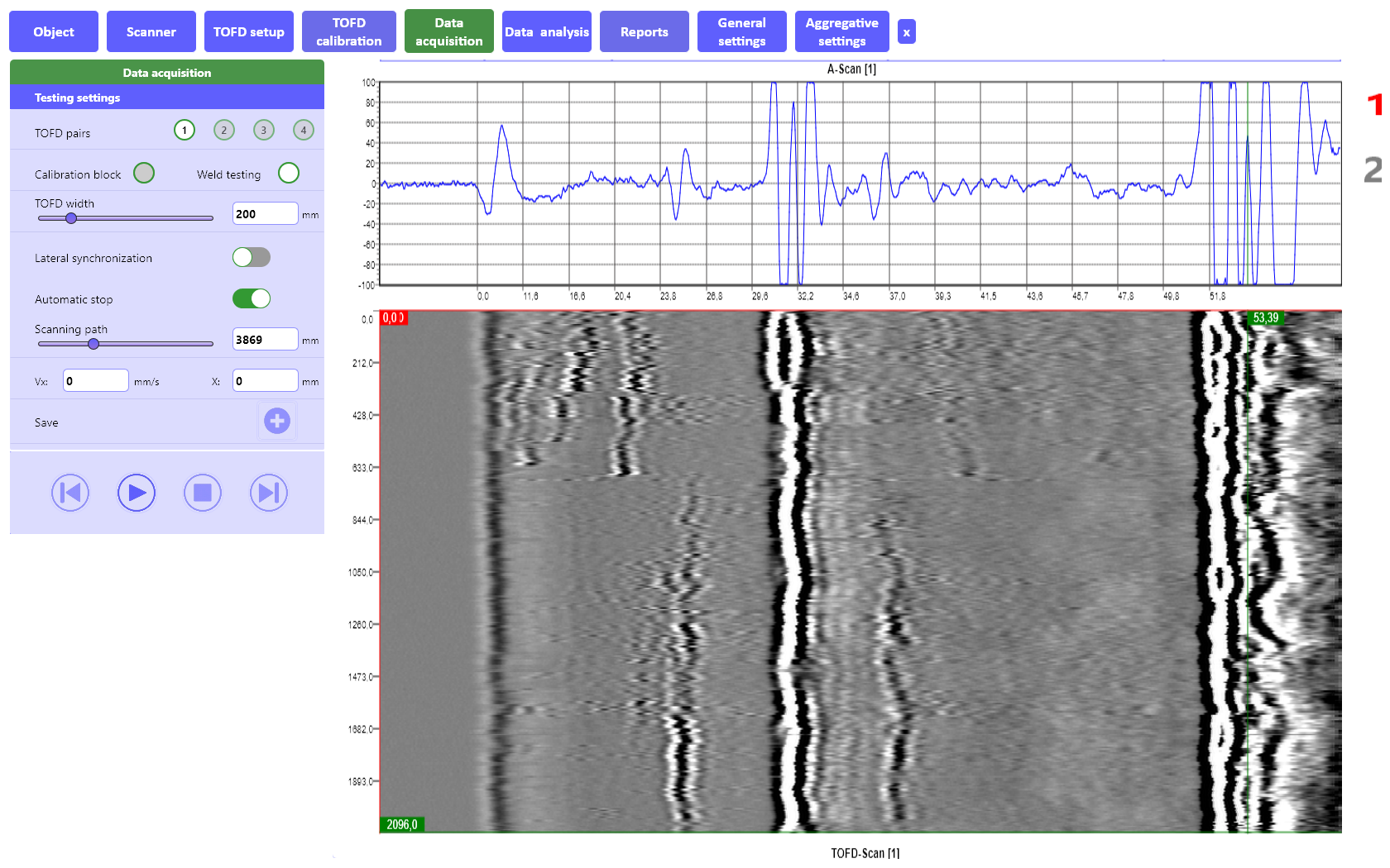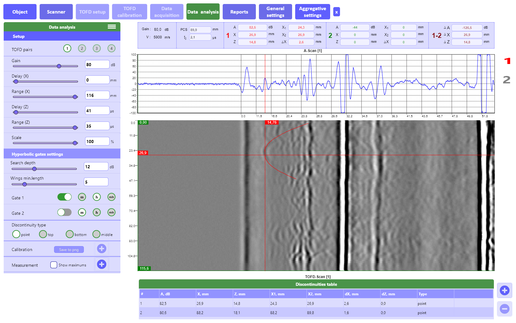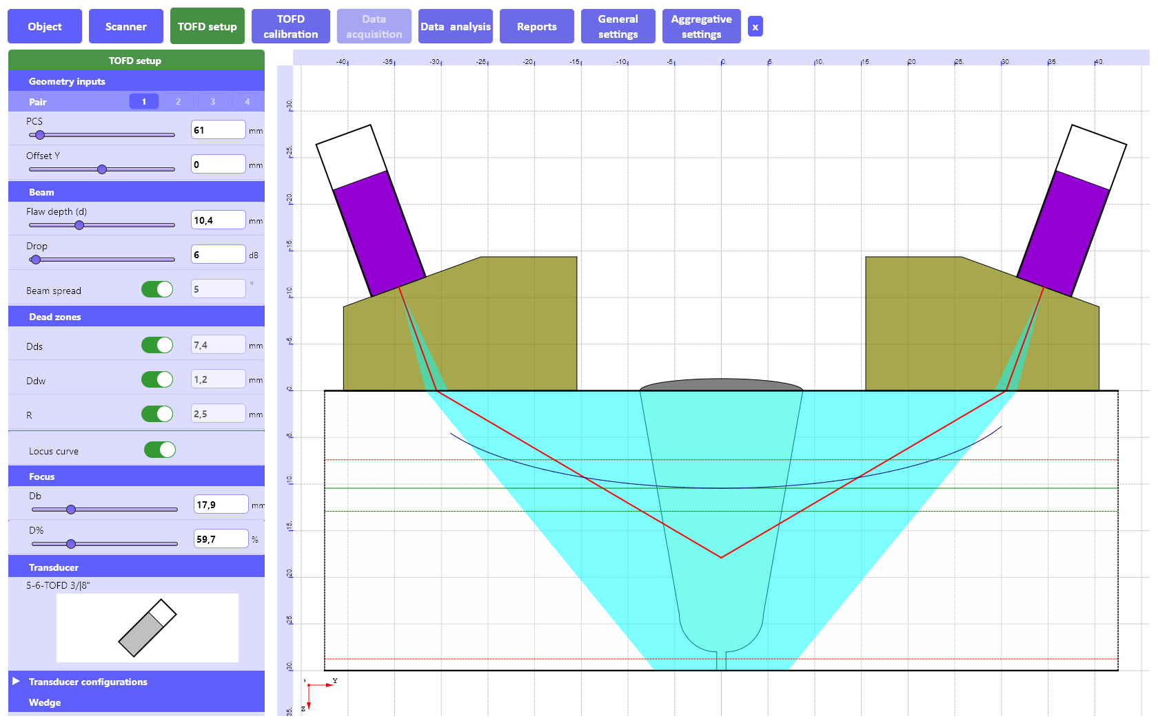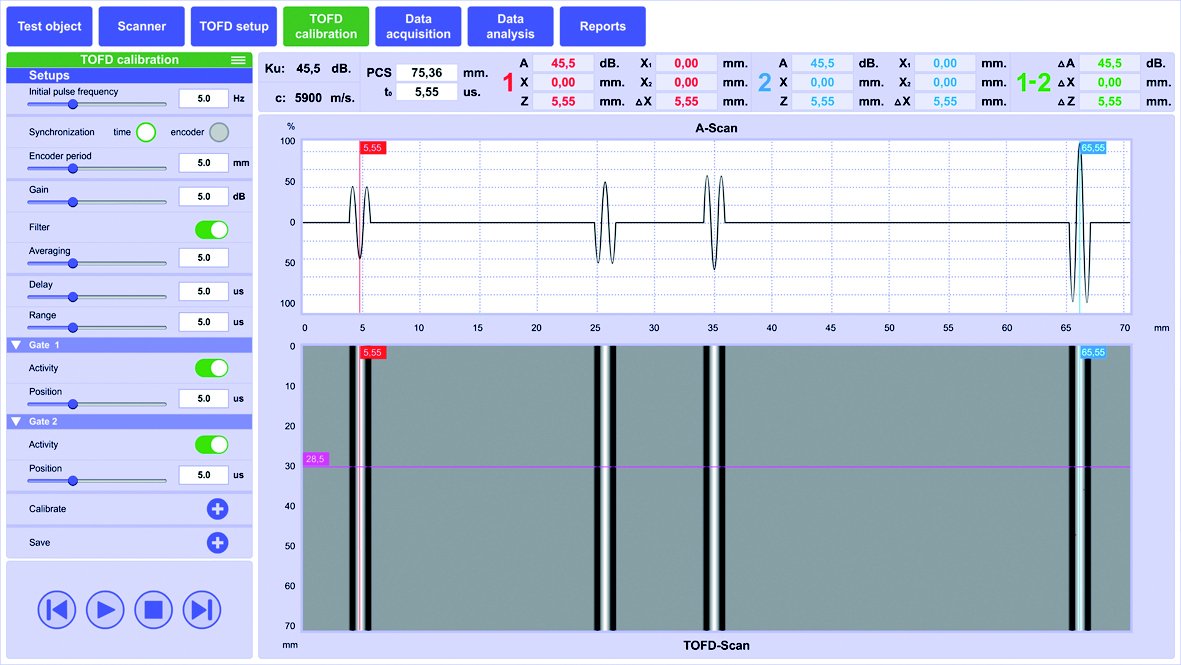 TOFD系統的軟件由一系列選項卡組成,操作員可以通過這些選項卡逐步執行設置,收集和分析數據的過程。該軟件中的操作既可以使用鼠標進行操作,也可以進行觸摸控制,因此可以在不同類型的計算機上運行-平板電腦,筆記本電腦,臺式計算機,多合一PC等。元素庫(幾何庫,材料庫,掃描儀庫,傳感器庫等)的廣泛使用大大簡化了設置過程。 因此,設置過程簡化為從庫中選擇必要的元素。為了完成單個監視任務,可以隨時保存并加載合適的完整配置包。