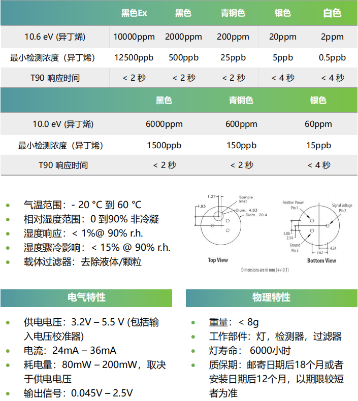 美國NovaPID – TVOC 光離子化傳感器 相關參數(shù):