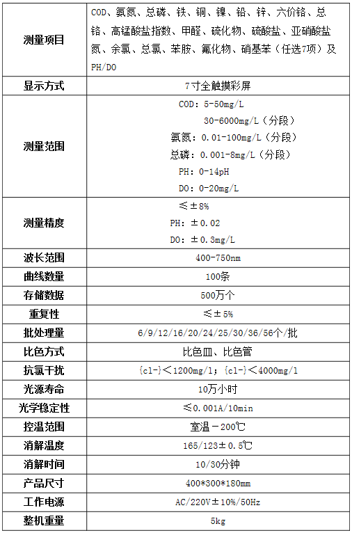準(zhǔn)確測(cè)定各種水體中的化學(xué)需氧量(COD)、氨氮、總磷、鐵、銅、鎳、鉛、鋅、六價(jià)鉻、總鉻、高猛酸鹽指數(shù)、甲醛、硫化物、硫酸鹽、亞硝酸鹽氮、余氯、苯胺、氟化物、硝基苯(任選7項(xiàng))及PH/DO等指標(biāo)