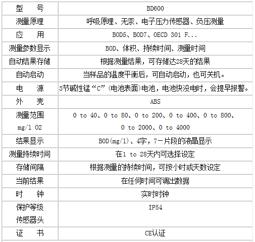 測量范圍包括0 to 40mg/l BOD及0 to 4000mg/l BOD