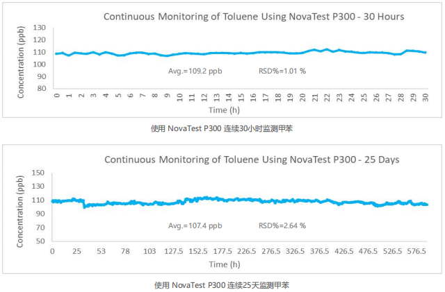 NovaTest P300采用世界領先的美國微流專*技術、MEMS設計, 峰形好、半峰寬窄,相比于傳統GC大大縮短了分析時間。同 時,P300支持連續測試,客戶可根據應用需求設定任意測試頻率,連續監測分析VOC混合物。下列結果為30小時和25天對甲苯的 連續測試數據,每30分鐘進行一次測試。