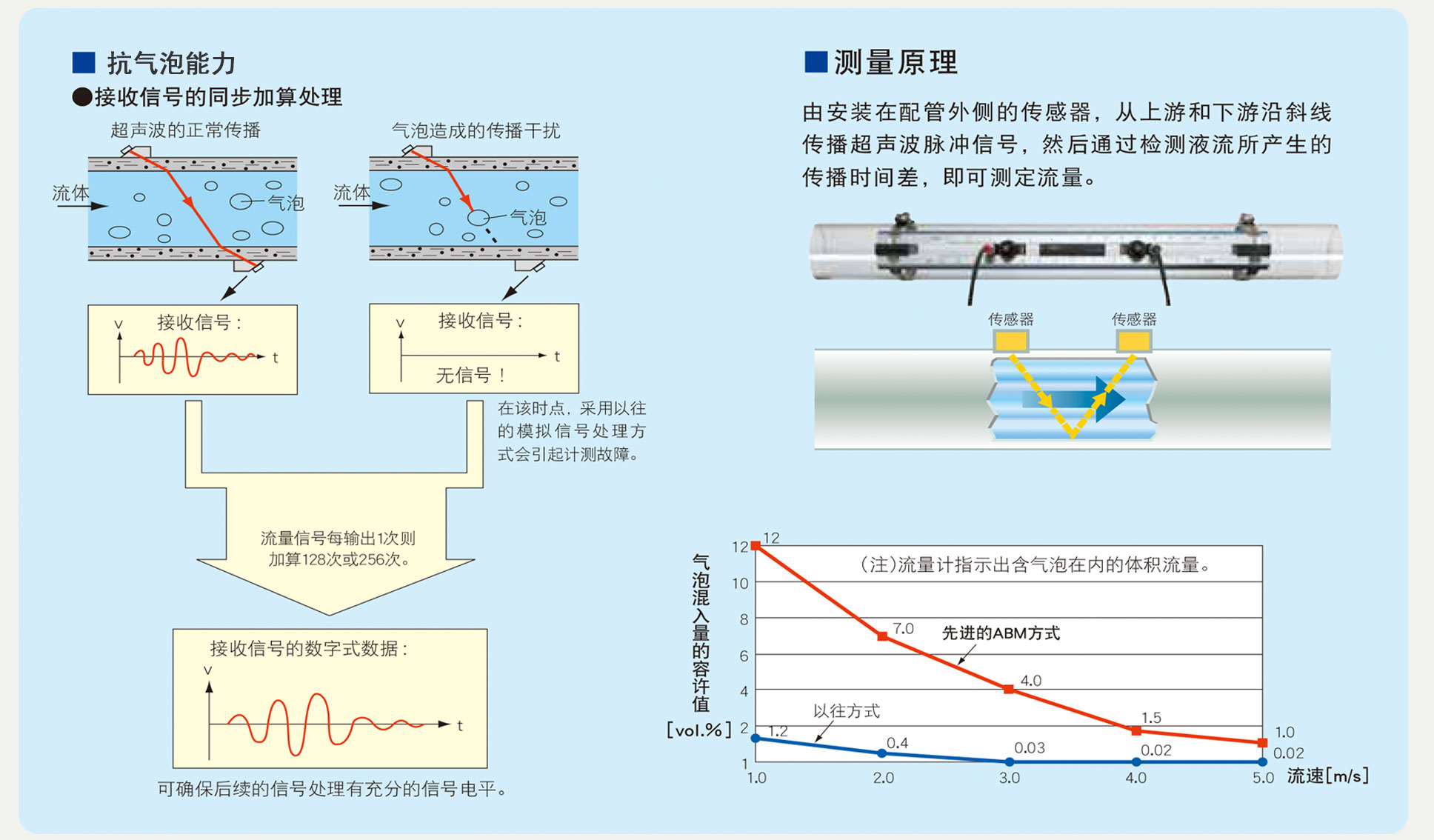 富士FLR超聲波流量計耐氣泡性優(yōu)越,最適合機(jī)械裝置配套使用的小型變換器。 可以測量從配管口徑φ25~φ1200mm的液體流量。