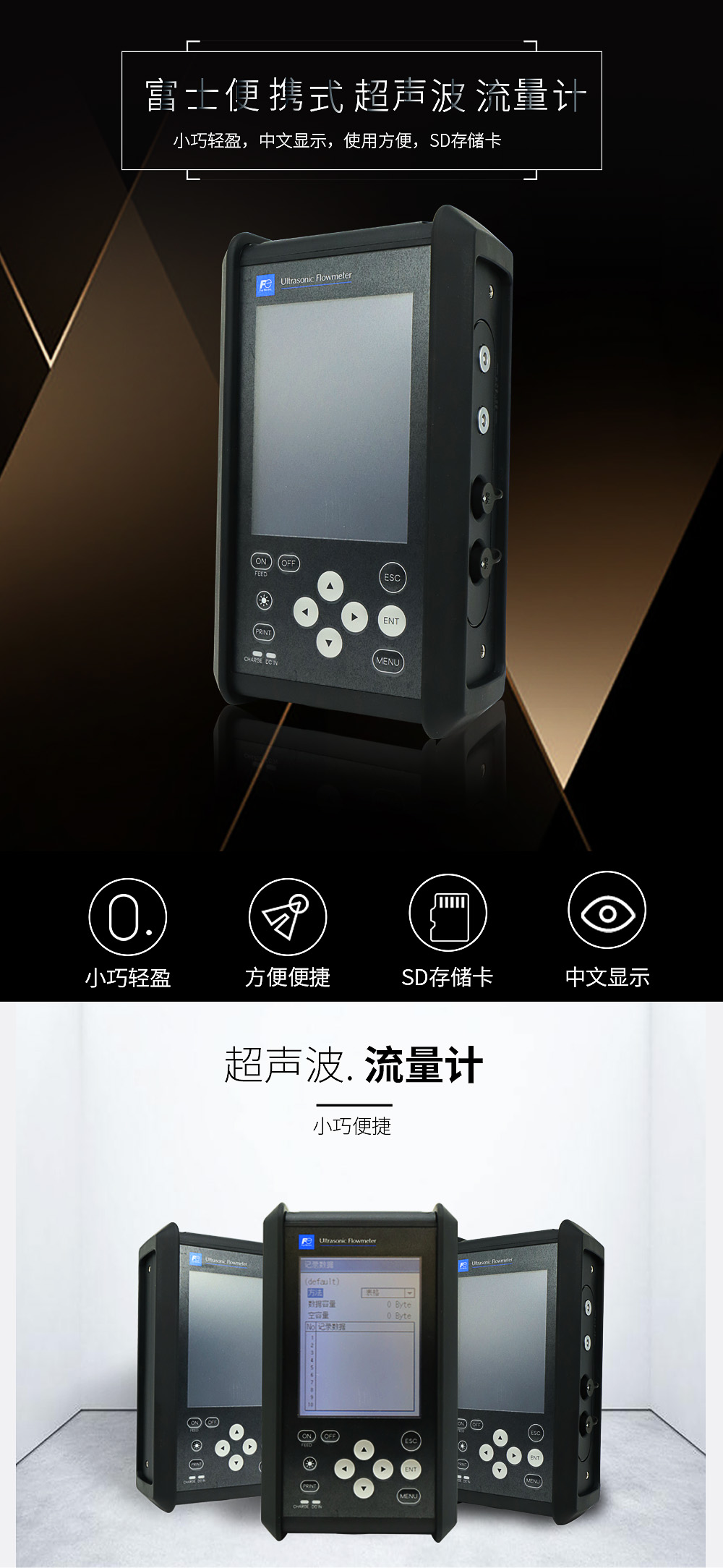 這是一種小巧輕盈的便攜式超聲波流量計。 測量數據可保存在SD存儲卡中。