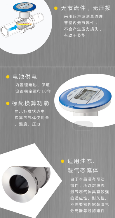 采用超聲波時(shí)差法準(zhǔn)確測(cè)量氣體流量,耐腐蝕,穩(wěn)定可靠,精度高廣泛應(yīng)用于各種氣體流量的測(cè)量。無(wú)節(jié)流件,無(wú)壓力損失,可對(duì)壓力不到1MPa的空氣進(jìn)行流量測(cè)量。可選擇螺紋式、對(duì)夾式法蘭或者是法蘭的連接方式。可提供鋰電池供電無(wú)需布線