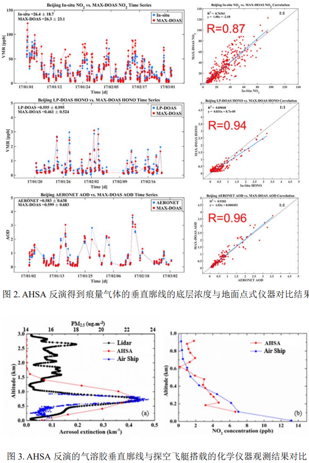 準(zhǔn)確性:提取 AHSA 反演得到痕量氣體的垂直廓線的底層濃度與地面點式儀器進行對比驗證,發(fā)現(xiàn)痕量氣體的濃度和變化趨勢一致性較高。如圖 2 所示,AHSA 反演的 NO2HONO 廓線底層濃度和地面點式儀器的結(jié)果相關(guān)性 R 值可達 0.8 以上。提取 AHSA 反演得到的 AOD 結(jié)果與 NASA 的 AERONET 站點AOD 數(shù)據(jù)對比發(fā)現(xiàn),兩者不僅量級接近,變化趨勢也趨近一致,相關(guān)性 R 可達0.9 以上。AHSA 觀測的污染物垂直廓線與探空飛艇搭載的化學(xué)儀器觀測結(jié)果相比,觀測的廓線形狀具有很高的一致性(圖 3)。此外,通過多次參與國際同類型儀器聯(lián)合觀測外場試驗(如:CINDI2,見圖 4),其反演的痕量氣體柱濃度和垂直廓線與國際同類儀器相比,準(zhǔn)確度也很高,準(zhǔn)確的數(shù)據(jù)質(zhì)量和空氣質(zhì)量評估結(jié)果得到了同行業(yè)國內(nèi)權(quán)威專家們的一致好評(Tirpitz et al., 2018)。相關(guān)對比驗證結(jié)果已發(fā)表在國際大氣環(huán)境權(quán)威期刊(如 ACP、AE、SR)上(Su et al., 2016; Liu et al., 2016; Xing et al., 2017; Hong et al., 2018; Tan et al., 2018)。