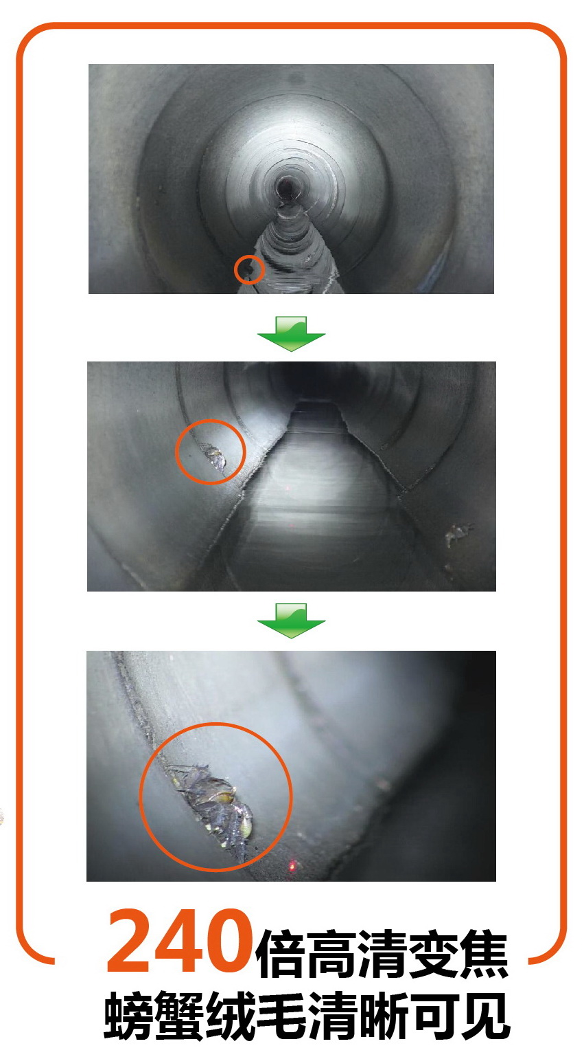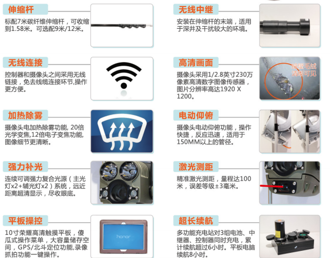 高清無線潛望鏡可用于快速檢測(cè)、診斷管道內(nèi)部狀況,在檢測(cè)過程中,視頻將通過無線信號(hào)傳輸?shù)绞殖质焦I(yè)平板控制器上,可以方便地通過觸摸屏上的虛擬按鈕,控制機(jī)頭的俯仰,從而獲取管道缺陷位置處的清晰圖像; 同時(shí)可抓取、保存缺陷圖像,錄入文字、缺陷代碼,疊加顯示并保存到視頻中,并可形成打印文檔。