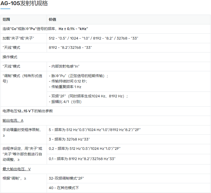 俄羅斯TECHNO-AC品牌電纜管道定位器AG-309.15N發(fā)射機AG-105 產(chǎn)品參數(shù):