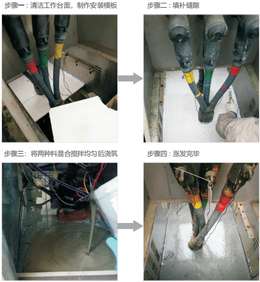 防水防凝露封堵劑是采用高分子矩陣技術研制而成的一種高活性化學物質, AB 兩組現場攪拌混合,倒入柜子底部后可快速自流平,隨后膨脹固化成型形成密封體。適用于:高低壓開關柜、電纜分支箱、開閉所、環網柜、端子箱、匯控柜、機構柜、風力箱變、光伏箱變、高鐵專用箱變及其它電力設備電纜室進出防凝露封堵,完全阻斷凝露濕氣源頭,根治凝露產生以及小動物進入電柜等產生的電力安全隱患。
