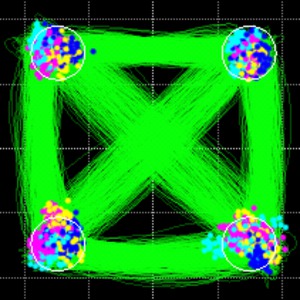 顏色鍵星座–如果先前的符號位于象限1(右上)中,則當前符號的顏色為黃色。如果先前的符號在象限2(左上方)中,則當前符號為洋紅色。如果先前的符號位于象限3(左下方)中,則當前符號為淺藍色(青色)。如果先前的符號位于第4象限(右下方)中,則當前符號為純藍色。