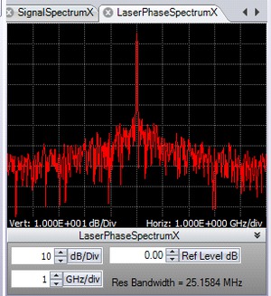 校正后的電場隨時間變化的FFT可以揭示很多有關數據信號的信息。頻譜不對稱或偏移可能表明激光頻率誤差過大。頻譜的周期性顯示數據支路之間的相關性。激光相位與時間數據的FFT可用于測量激光相位噪聲。