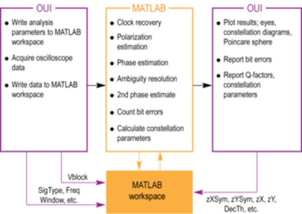 OUI接收有關用戶提供的信號的信息以及來自示波器的采集數據,并將其傳遞到MATLAB工作區,如下圖所示。然后調用一系列MATLAB腳本來處理數據并產生結果字段變量。然后,OUI檢索這些變量并繪制它們。可以通過連接到OUI或直接連接到MATLAB工作區來完成自動化測試。