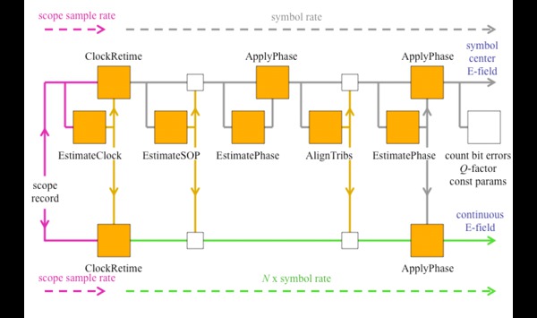 對于實時采樣系統,數據采集之后的第一步是恢復時鐘并在符號中心以每個符號1個采樣的頻率重新定時數據,以進行偏振分離和后續算法(在圖中以上方路徑顯示)。還以10倍的波特率(用戶可設置)對數據進行重新采樣,以定義將眼圖中或星座圖中的符號相互連接的跡線(顯示為下部路徑)。