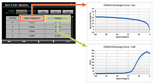 請參閱電池型號的各重要參數,其中包括開路電壓、內阻、剩余電量和充電狀態。
