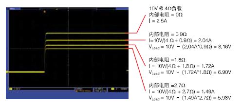 使用可編程內(nèi)部電阻,仿真電池的輸出。在這個例子中,Model 2260B-80-13 電源仿真一塊 10V 電池,其內(nèi)部電阻是0W、0.9W、1.8W 和2.7W。由于經(jīng)過電池內(nèi)部電阻的電壓下跌,輸 出端子上得到的電壓從10V 下跌到5.98V。