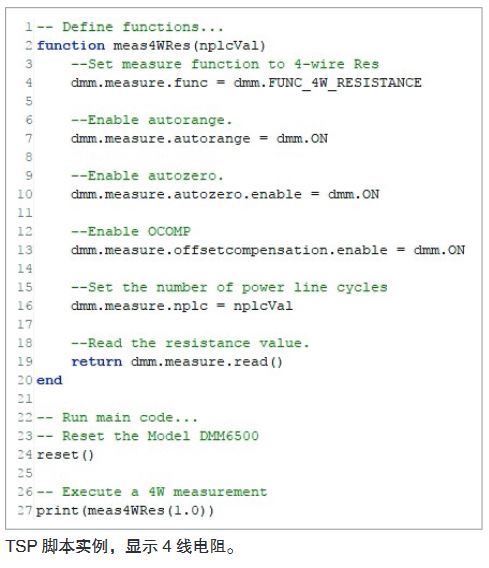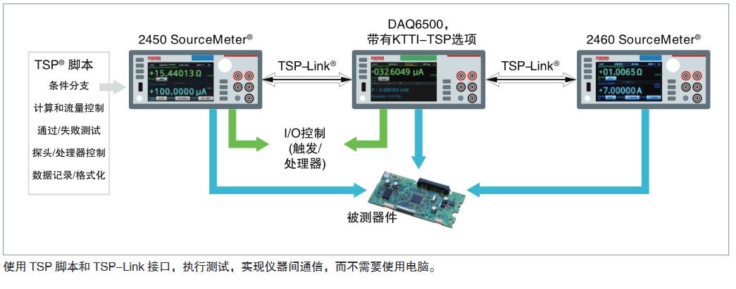 TSP? 腳本可以在儀器上直接運行強大的測試腳本,而不需使用外部電腦控制器。這些測試腳本是完整的測試程序,基于簡便易用而又高效緊湊的腳本語言 LUA (www.lua.org)。腳本是由儀器控制命令和 / 或程序語句組成的一個集合。程序語句控制腳本執行,提供了變量、函數、分支和循環控制等工具。您可以創建強大的測量應用,而不需集成開發環境 (IDE)。測試腳本可以包含傳統編程語言執行的任何程序序列(包括決策算法),因此儀器可以管理測試的方方面面,而不需要與電腦通信來制訂決策。這消除了由于 GPIB、以太網或 USB 業務擁堵而導致的延遲,大大改善了測試時間。