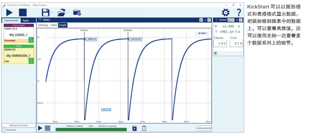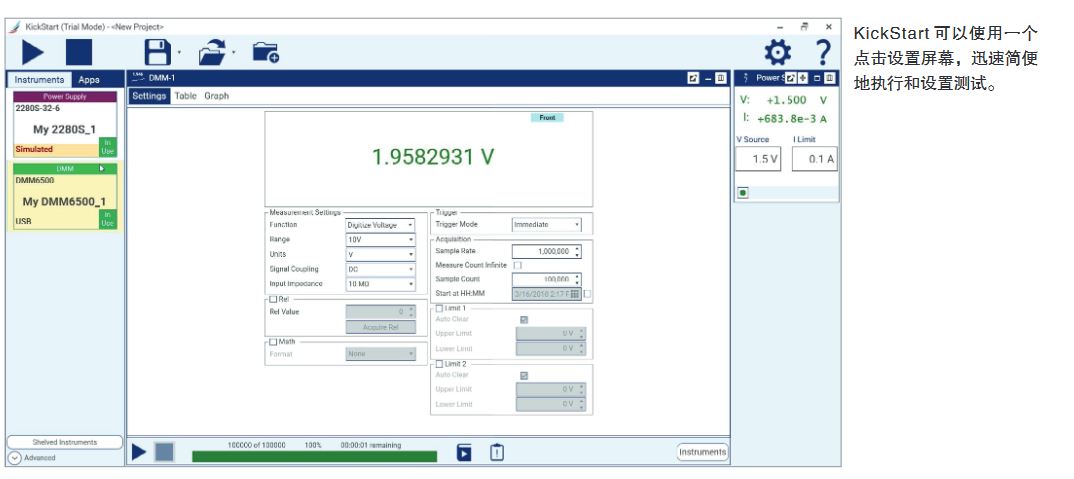 KickStart 可以配置、測試及從多臺儀器采集數據,包括 DMM、電源、SMU 儀器和數據記錄器。您可以同時控制最多 8 臺儀器,從每臺儀器中檢索數百萬個讀數。這使得 KickStart 成為一個優異的解決方案,可以滿足數據記錄需求,使用模數轉換 DMM 從瞬態事件中捕獲大量數據。