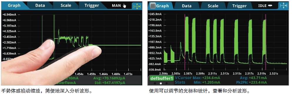 A/D 轉換器,可以用來執行電壓或電流測量,特別適合捕獲瞬態異常信號,或幫助繪制功率事件曲線,比如當今電池供電的器件的工作狀態。電流和電壓可以使用可編程 1MS/s 16 位模數轉換器進行模數轉換,可以直接采集波形,而不用使用單獨的儀器。