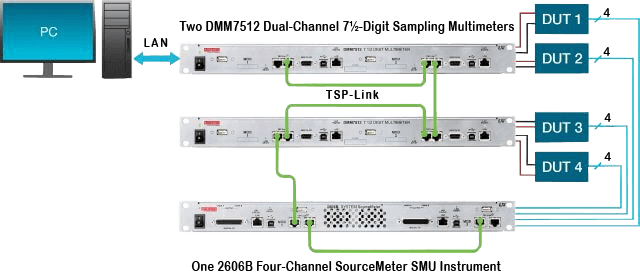 每臺 DMM7512 中的兩個 DMM 具有內(nèi)置智能,可以使用其測試腳本處理器 (TSP?) 技術在無需 PC 交互的情況下執(zhí)行測試程序。此外,每個 DMM 都具有 TSP-Link? 硬件接口,因此一臺儀器可以控制主從配置中的其他儀器。