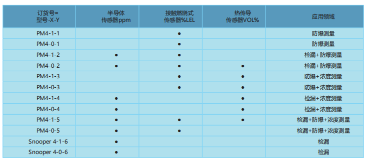 為方便訂貨,我們給出下面訂貨規(guī)則是:主機型號-X-Y,其中主機型號=PM4 或者為Snooper 4; X=1 表示泵吸, X=0 表示擴散; Y=1表示%LEL量程,Y=2表示PPM+ %LEL量程, Y=3表示LEL+ VOL%量程, Y=4表示PM+VOL%量程, Y=5表示PPM+ %LEL+ VOL%量程,Y=6表示PPM單量程檢漏。