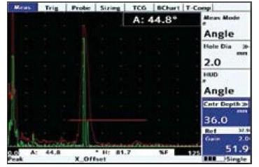 通過新的角度測量模式可以很容易的快速準確測量聲束輪廓。儀器自動從已知直徑的鉆孔轉換成聲束反射點的深度。使用內置峰值檢測模式,如圖所示,任何傳感器的聲束輪廓可以即刻確認。