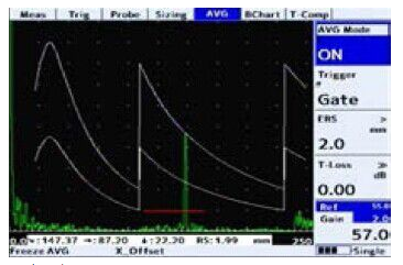 獨立的DAC&AVG/DGS 在DAC或DGS/AVG曲線中,添加多達3個增益范圍(+12db, +24dB),對大型型材和高衰減材料進行單程掃描。符合EN583-2:2001標準。 可選