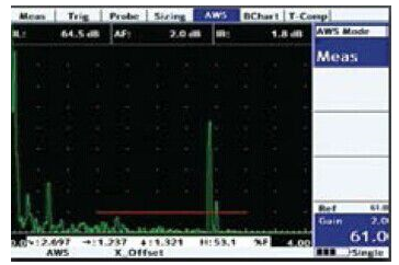 可選功能,滿足AWS D1.1標準,能夠計算并顯示缺陷水平測量(IL),衰減因數(AF),缺陷等級(IR)等參數。