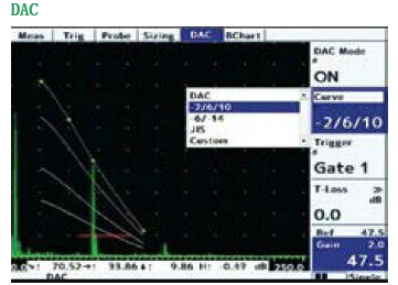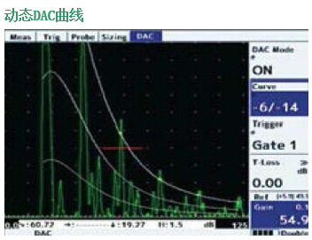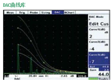 多達20個參考點可以用于DAC曲線的創建,內置JIS/ASME 和EN1714標準曲線可供選擇。用戶可以選擇用DAC曲線或閘門1來監測缺陷?;夭ㄕ穹梢詃B DAC,% DAC,或% 全屏高度來顯示。