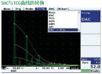 DAC曲線可以轉換成TCG曲線,隨后也可以轉換成原來的DAC曲線。轉換需要的參考點已經被采集,并且保存最左邊點的參考增益,以便所有的參考回波可以被設置為80%FSH。