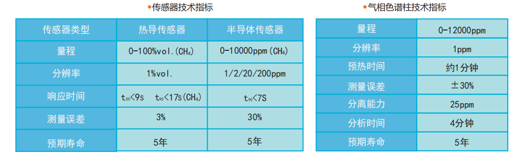 半導體傳感器:PPM濃度測量;熱導傳感器:用于Vol濃度測量和配比檢測;