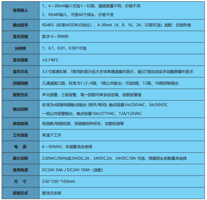 我公司設(shè)計的主機(jī)報警控制器H-110模塊化結(jié)構(gòu)設(shè)計,標(biāo)準(zhǔn)通道為1路(最多32路)4-20mA輸入信號,同時可接255路RS485輸入信號,更多通道輸入信號可訂做,控制器與控制器之間可以互相通訊。并且4-20mA與RS485可同時輸入;數(shù)據(jù)輸出支持標(biāo)準(zhǔn)MODBUS協(xié)議,同時可選配:8路4-20mA輸出、以太網(wǎng)模塊、支持云端的上位機(jī)電腦監(jiān)控軟件。