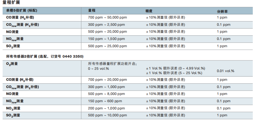 O2、CO2、CO、NO、NOlow、°C和hPa等參數的精度符合E N50370 Part 2。預標定式傳感器(更換或升級傳感器后無需標定即可測量)同樣符合上述標準。