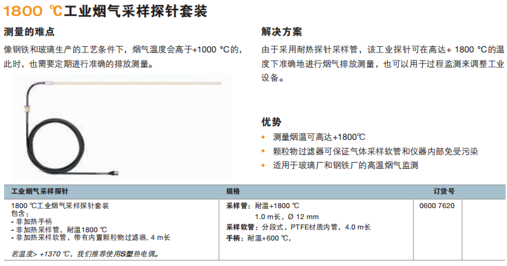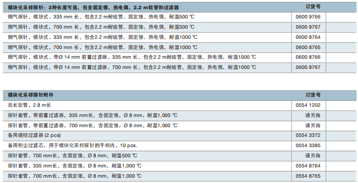 用于煙氣采樣,煙氣溫度和煙氣流量測(cè)量的模塊化煙氣探針(335毫米/ 700毫米)可以通過(guò)標(biāo)準(zhǔn)的工業(yè)連接口方便地連接到測(cè)量?jī)x器。根據(jù)現(xiàn)場(chǎng)的實(shí)際情況,可以非常方便的改變探針的長(zhǎng)度和探針是否配有預(yù)過(guò)濾器。探針的耐溫以及內(nèi)置的熱電偶可以測(cè)量不同溫度范圍(+500 °C / + 1000 °C)的溫度。