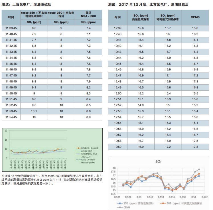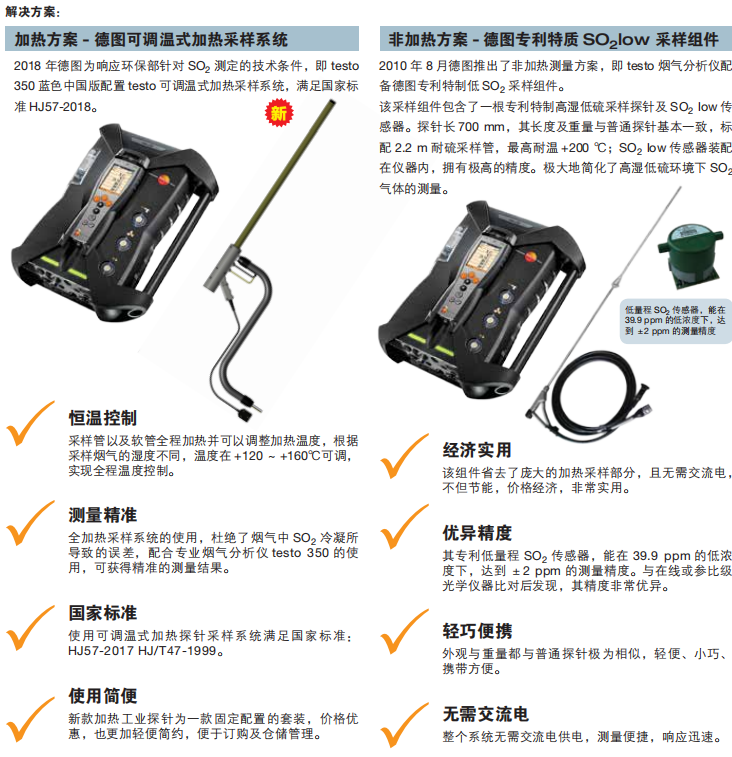 德圖專門開(kāi)發(fā)了低濃度SO2傳感器以及非加熱的高濕低硫探針和加熱型工業(yè)煙氣采樣探針,用于測(cè)量脫硫裝置中低濃度的SO2。為了進(jìn)行準(zhǔn)確的測(cè)量,可以將加熱型探針和非加熱型探針進(jìn)行配合使用。配有testo 350煙氣分析儀和帶有蠕動(dòng)泵的帕爾貼氣體調(diào)節(jié)裝置,用于自動(dòng)冷凝排水。可以完美測(cè)量在高濕低硫工況下的低濃度SO2測(cè)量。