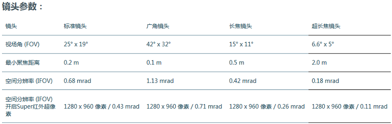 可選配4種鏡頭,滿足不同測(cè)量需求:標(biāo)準(zhǔn)鏡頭(25° x 19°),廣角鏡頭(42° x 32°),長(zhǎng)焦鏡頭(15° x 11°),超長(zhǎng)焦鏡頭(6.6° x 5°)