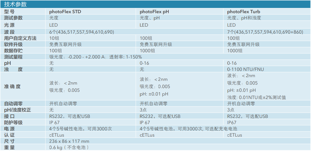 基本指標同 pHotoFlex pH,增加濁度測試功能,性能如下: