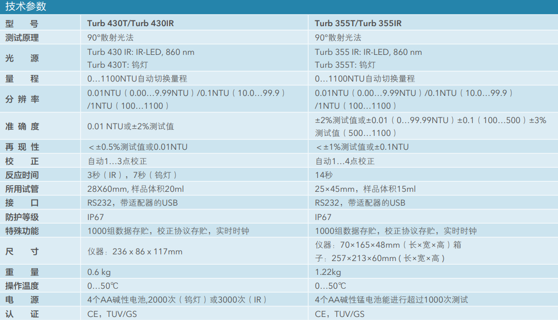 賽萊默XYLEM便攜濁度分析儀 Turb 430T/430IR/355T/355IR產品技術參數: