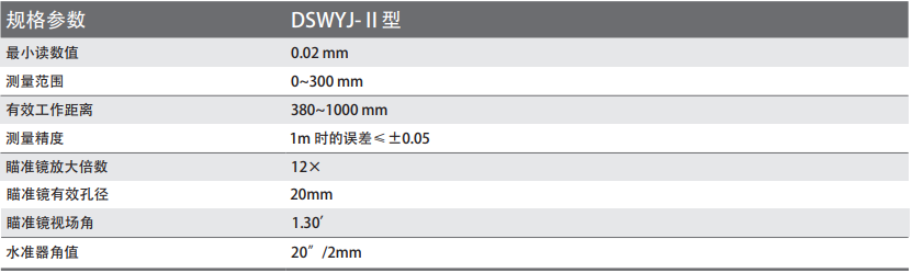 DSWYJ-Ⅱ型讀數望遠鏡,該儀器應用幾何光學原理,對目標物上的水平線段(或水平面)在垂直方向上的位置或垂直高度差,進行非接觸精密測量和讀數,達到垂高計的作用。特別能精確讀取玻璃液體溫度計的示值,是溫度計制造、檢定和使用中必備之理想讀數工具。