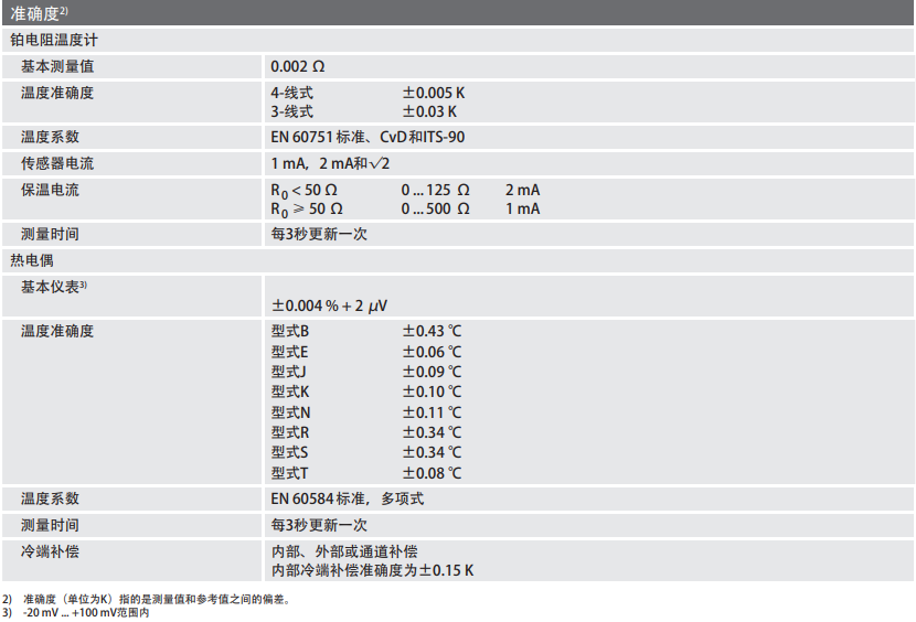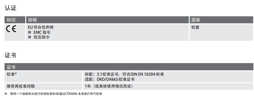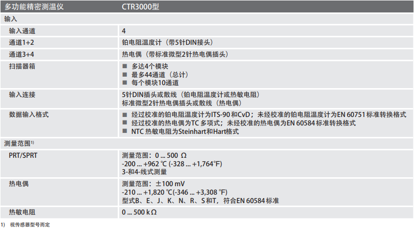 CTR3000 在使用時可選擇3線或4線(標準)鉑電阻溫度計(25Ω和100Ω)或標準鉑電阻溫度計,同時也可以匹配大多數(shù)的國際標準熱電偶和負溫系數(shù)熱敏電阻(NTC 熱 敏電阻)。溫度測量單位多樣可選擇,包括℃、℉、K。此外,基準的測量單位mV和Ω也將顯示在屏幕上。溫度值可通過對基準測量值換算得出。