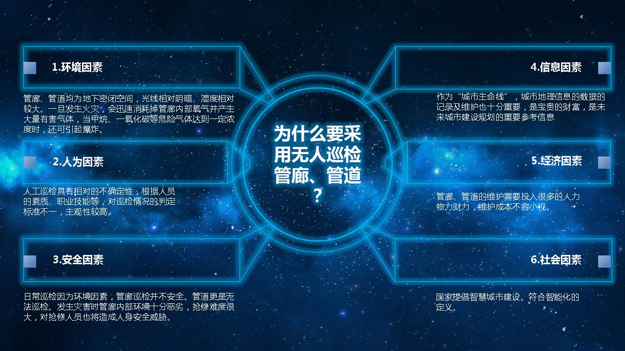作為城市運(yùn)行的生命線,地下綜合管廊承載信息與能源的傳輸重任,同時(shí)也形成未來(lái)都市的地下高速網(wǎng)絡(luò)。管廊內(nèi)苛刻的環(huán)鏡紛雜的設(shè)施,使傳統(tǒng)的人工巡檢已無(wú)法滿足安全運(yùn)維和災(zāi)害應(yīng)急工作。傳統(tǒng)管道機(jī)器人從20世紀(jì)末傳入中國(guó),雖說(shuō)在一定程度上解決了我國(guó)的管道檢修問(wèn)題,但這種亡羊補(bǔ)牢式的維護(hù),治標(biāo)不治本、且如果未來(lái)我國(guó)要對(duì)全城管道進(jìn)行年檢,投資成本將無(wú)法估量,政府無(wú)力承擔(dān),所以說(shuō)傳統(tǒng)的管道機(jī)器人已經(jīng)無(wú)法滿足中國(guó)現(xiàn)代城市管理的需求。2015年國(guó)務(wù)院允許民營(yíng)資本進(jìn)入城市基礎(chǔ)設(shè)施建設(shè),我國(guó)管廊建設(shè)已經(jīng)進(jìn)入如火如荼的階段,截止目前為止,多個(gè)城市試點(diǎn)已基本完成,這一大前提下,USR優(yōu)系統(tǒng)應(yīng)用而生-管廊軌道式巡檢機(jī)器人。