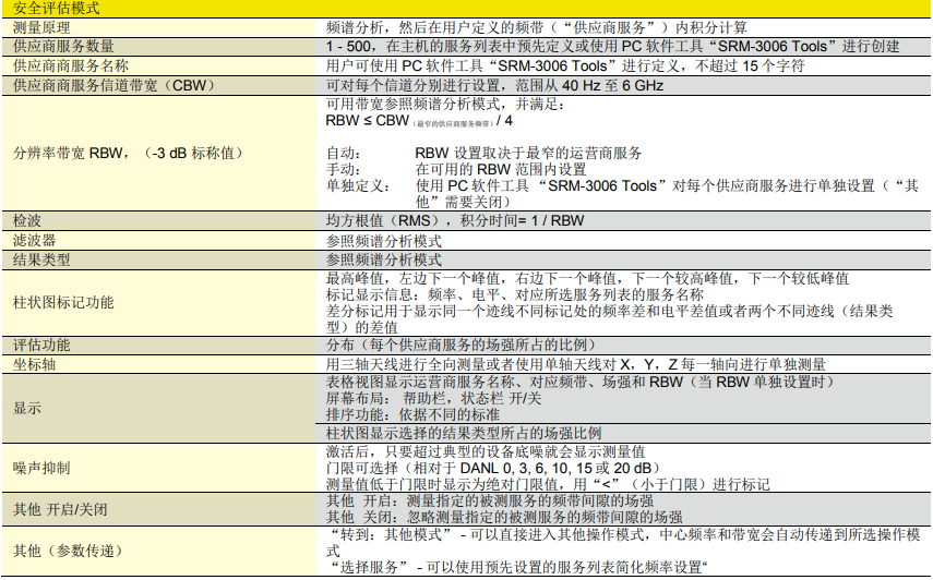 | 評估功能 | 峰值列表(多達50個峰值結果)?用戶設定頻率范圍的積分功率(信道功率) |