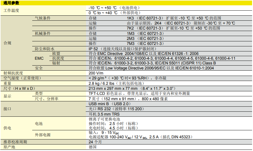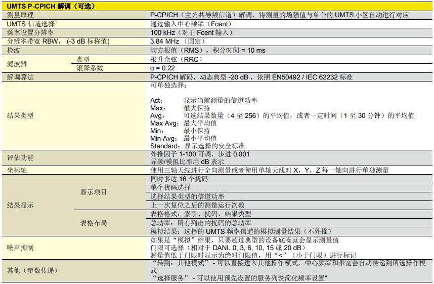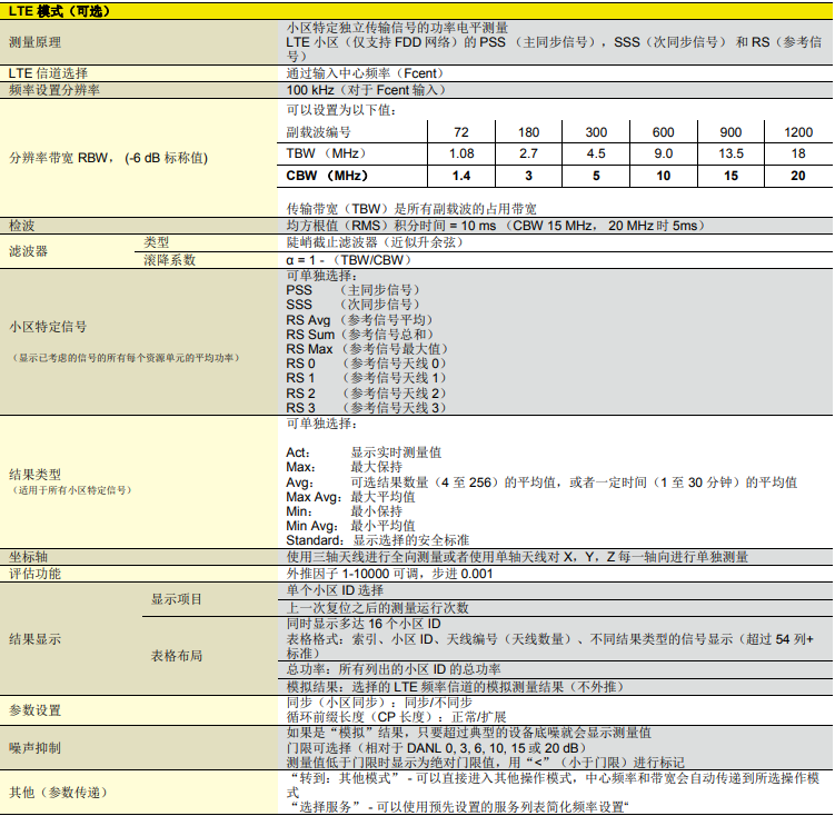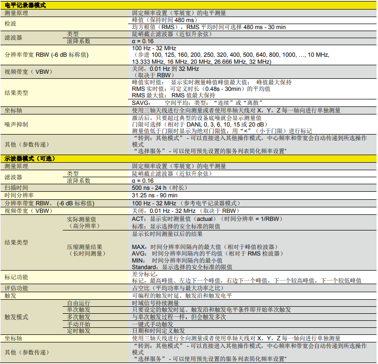 | 工作模式 | 頻譜分析、安全評估、電平記錄器、示波器(可選)、UMTS P-CPICH解調(可選)、LTE(可選) |