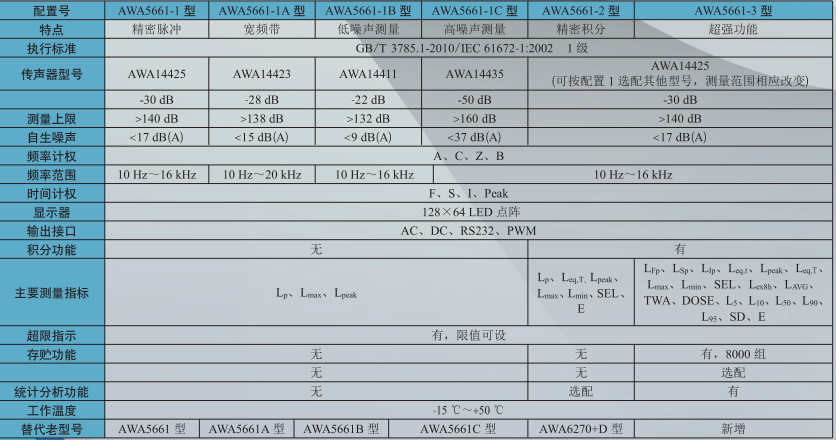 由于AWA5661型模塊化設(shè)計(jì),配置按需選取,主要技術(shù)性能也有差異,詳情見下表: