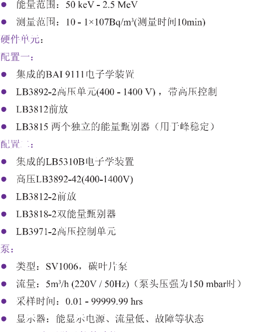 BAI9122用于移動監測空氣中的131I,用戶可選擇不同厚度的鉛已達到最好的測量結果。通過安裝在監測儀入口的預過濾器過濾采樣空氣,然后空氣進入測量單元,測量單元包括探頭和碘。在系統的低端,碳葉片泵通過噪聲消聲器把空氣排出監測儀。預過濾器和消聲器可更換。
