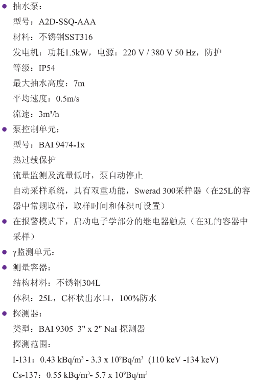 BAI9125水在線監(jiān)測(cè)系統(tǒng)就是用于在線連續(xù)監(jiān)測(cè)生活飲用水、水庫等水源中的總γ活度,系統(tǒng)構(gòu)成包括:采樣系統(tǒng)、配水及管路清洗裝置、水樣預(yù)處理系統(tǒng)、在線測(cè)量?jī)x器、數(shù)據(jù)采集與傳輸系統(tǒng)、信息處理與遠(yuǎn)程監(jiān)控中心系統(tǒng)、站房及輔助設(shè)備。