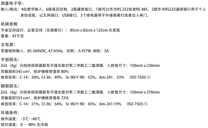 緊湊的多功能的污染監測儀用于輻射防護領域,同時進行手部手背腳部α、β/γ測量,可移動的手背探頭可用于衣物污染測量。可選配個人編碼卡和讀卡器進行人員身份識別。