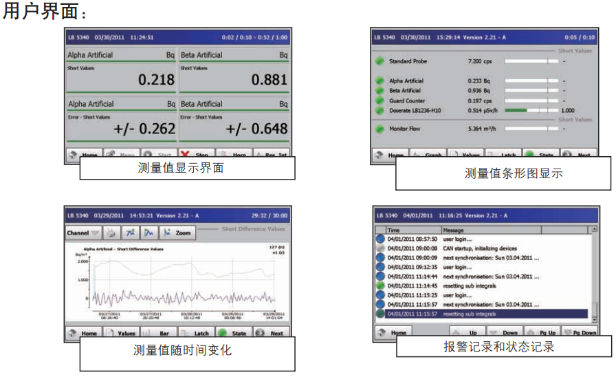 報(bào)警:用戶可分別定義α和β的報(bào)警值。報(bào)警支持抽氣體積報(bào)警、排放率報(bào)警和活度報(bào)警(Bq/m3;Bq/h;Bq/天、周、月)。采用聲光雙重報(bào)警方式